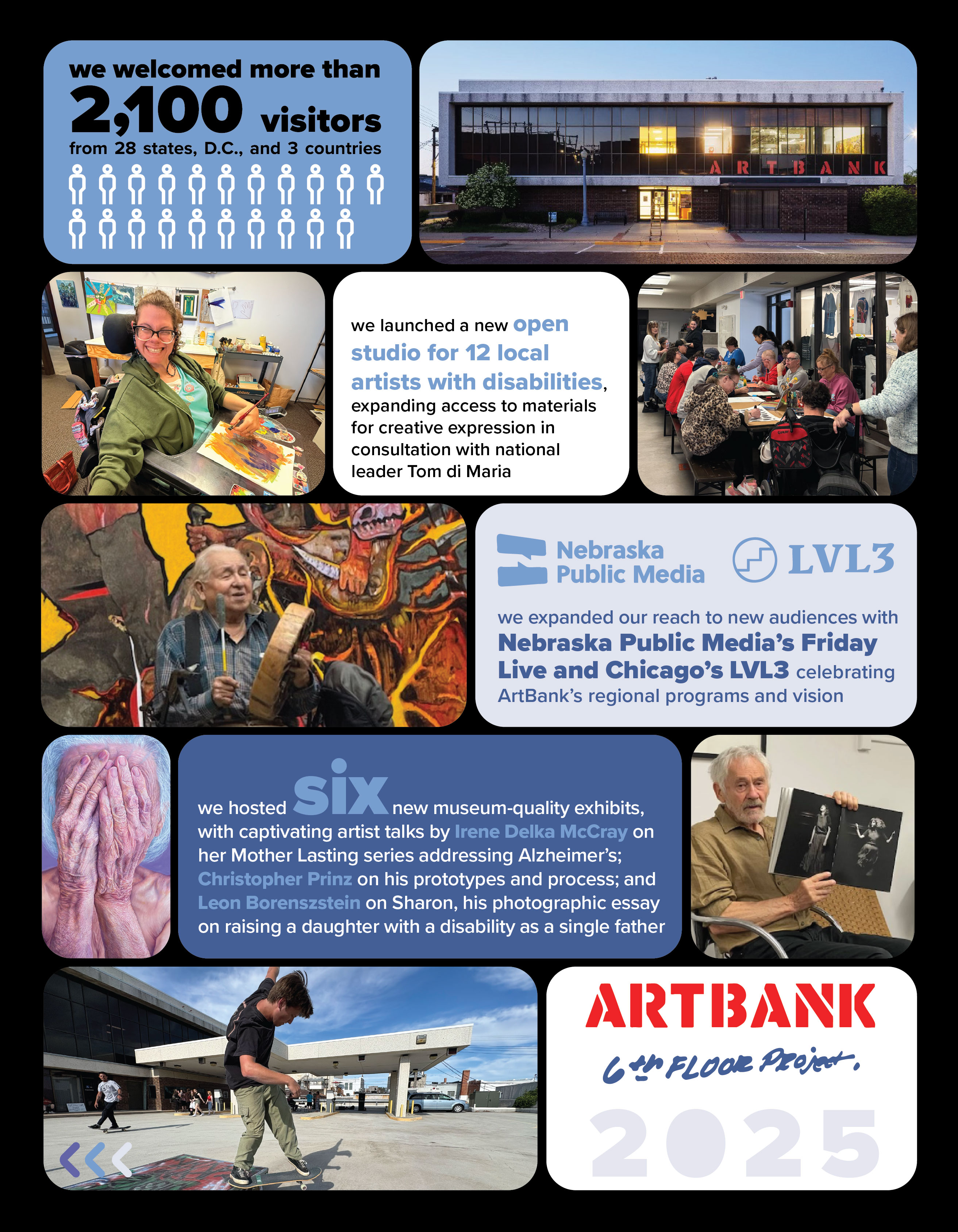 We need your help. We are preparing for the 2026 season at ArtBank and 6th Floor to run from April through October when we will offer new exhibits of local and regional artists, expanded classes for youth, summer internships and docent program, additional open hours, and continue local, regional, and national partnerships to enhance community and make McCook a destination for art appreciation. We are a volunteer-based organization, with small stipends for a summer intern and art instructors. It costs approximately $150,000 annually to fund our non-profit facilities and programs.